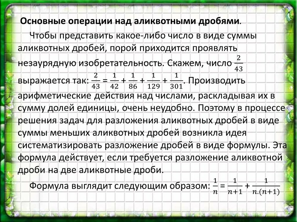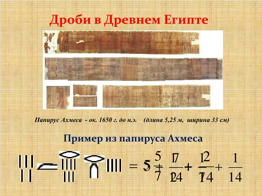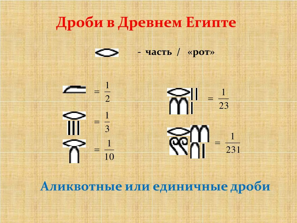 В Древнем Египте «настоящими», математики, считали только аликвотные дроби. Поэтому каждую дробь стремились представить в виде суммы меньших аликвотных дробей, причём с разными знаменателями.
